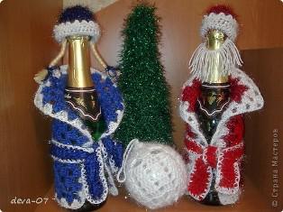 А мне нравятся вязаные крючком белые колокольчики. Второй год мечтаю связать, все руки не доходят. Что же наряда для бутылок, то в прошлом году несколько женщин из Харькова под Новый Год организовали целую мастерскую по их производству, продавали через Интернет, прославились на всю Украину.