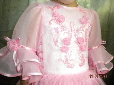 На спинке сделала тоже самое, также по центру спинки расположен шов, в который я втачала потайной замок. Рукава покроила фонариком, а к низу рукавов притачала по два волана, края воланов окантовала атласной лентой. Воланы покроила просто окружностью, а ее центральная окружность равняется обхватом низа уже чуть собранного низа рукава. На верхнем волане сделала фигурный разрез, по центру этого разреза пришила розочки, которые сделала сама из кусочков шифона. Горловину платья окантовала атласной лентой.